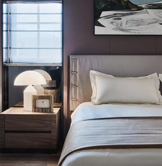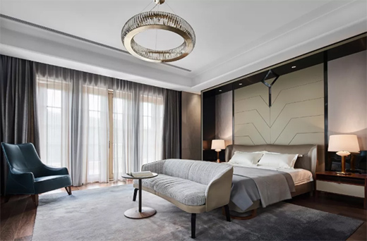 穿過樓梯間,主臥在樓層的一側,色調柔和,質地講究,不過于追求時尚,但隱藏的線條和肌理使人安逸。床頭淺灰綠背景墻在空間中十分亮眼,與深色地毯產生了空間過渡,窗邊精致的深色土耳其藍單人皮質沙發,為主臥畫龍點睛。正對床榻的抽象畫,詮釋著屋主不凡的品位。