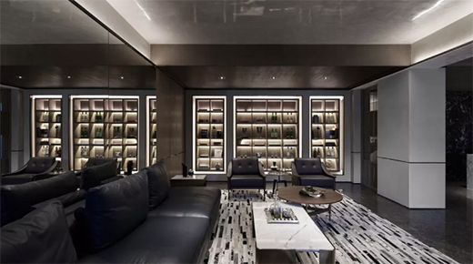 半開放式的紅酒雪茄區采用大片落地鏡面,延展了空間視覺。低調的黑色皮質沙發給人神秘而華貴的心理感受,精致的墻面展示柜為屋主留以足夠的空間陳列酒品、雪茄及各類周邊。