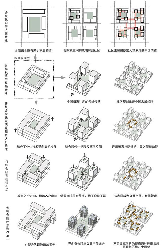 以此背景,設(shè)計(jì)從追溯到暢想,從傳統(tǒng)走向未來(lái),珍惜中國(guó)傳統(tǒng)合院形式帶來(lái)的人情溫暖,將其不適應(yīng)現(xiàn)代生活的空間重構(gòu),以此打造一個(gè)智慧共享、生態(tài)共生、全齡共樂(lè)、產(chǎn)城融合的“合樂(lè)”社區(qū)。