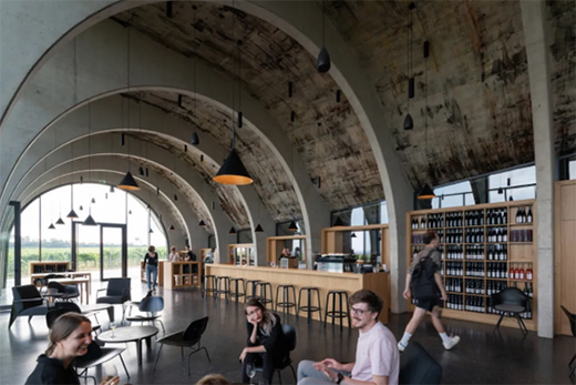建筑師將酒窖屋頂設計成獨特的波浪形,如同海浪一般靈動起伏,整個屋頂也將建筑與地面融合形成一體,巧妙的與周圍的葡萄園和諧共存。