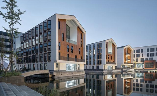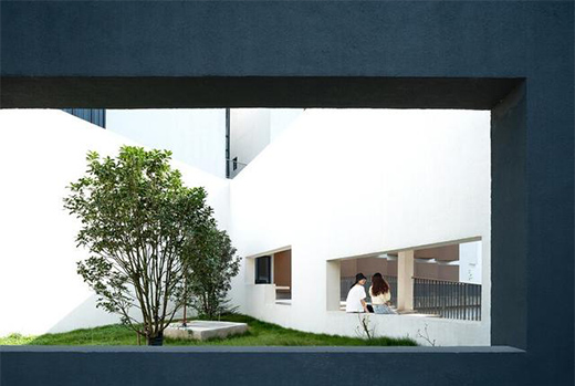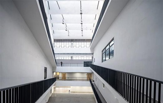 其中音樂北樓東側兩翼架設于水面之上,底部形成親水平臺,上部則設有兩層高的取景口。同時,與相鄰建筑采用連廊加強聯系,宜人的小空間柔化了建筑的尺度。位于主門廳二層的小音樂廳,采用深灰色大懸挑體量,強調出其在整個教學群中的獨特性。由于教學排練區與琴房區層高差異,設計巧妙利用坡道將不同標高聯系起來,并形成通高的共享音樂中庭。在充滿自然光線的空間中游走,體會建筑與音樂交融的魅力。