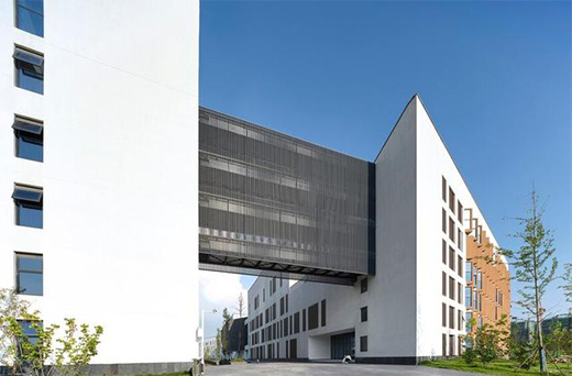 音樂樓位于安徽藝術學院西區教學組群西南角,是校園東西景觀軸的收尾。建筑由南側教學樓和北側琴房樓兩棟組成,二者在4-6層由廊橋聯系,廊橋下部形成3層高的巨大門洞,與校園西大門道路對應。建筑臨校園環路的外側,采用連續界面與其它專業教學樓形成整體,朝向內側的界面則曲折豐富,與景觀綠化產生積極的互動。