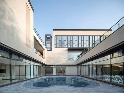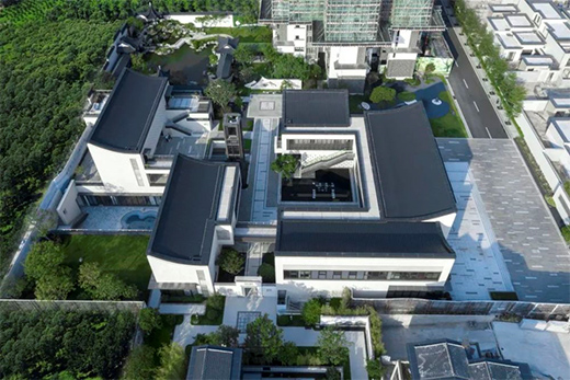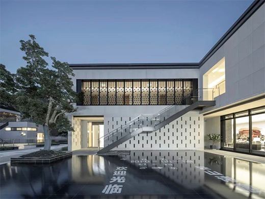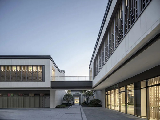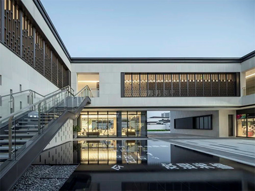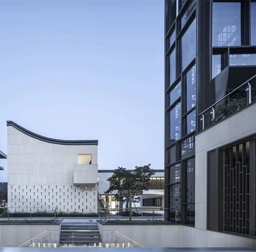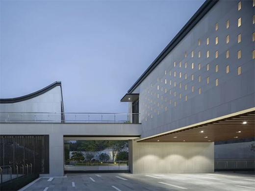 太古則沉悶,太新則無(wú)趣,建筑形式如何在中式與現(xiàn)代之間取得平衡,是立面設(shè)計(jì)的難點(diǎn)。我們將中國(guó)傳統(tǒng)的人字坡屋頂進(jìn)行裁剪,形成具有現(xiàn)代審美特征的非對(duì)稱單坡曲面,同時(shí)所有屋頂曲面向內(nèi)呼應(yīng)“四水歸堂”格局,外側(cè)是干凈的現(xiàn)代立面,內(nèi)側(cè)帶有坡屋頂?shù)闹惺巾嵨丁M瑫r(shí)采用金屬屋面,定制鋁合金格柵,仿石磚,玻璃磚等現(xiàn)代的材料組合,形成中式與現(xiàn)代交融的形式語(yǔ)言。