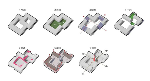 如果說(shuō)家是小院子,那么鄰里中心作為社區(qū)交往的核心就是一個(gè)大院子。超市、健身、影音、書吧等現(xiàn)代生活需求的引入,成為設(shè)計(jì)的切入點(diǎn),將院空間進(jìn)行連通切割,打破原有的封閉形式,結(jié)合交通流線向社區(qū)打開(kāi),重塑形成開(kāi)放、共享、活力的社區(qū)交往空間。