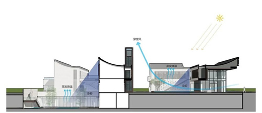 建筑要融入環(huán)境,成為我們生活的一部分,適應(yīng)地域氣候是非常重要的。本項(xiàng)目地處華南地區(qū),是典型的夏熱冬暖亞熱帶氣候,因此設(shè)計(jì)中借鑒了傳統(tǒng)嶺南地區(qū)建筑降溫的方法,一方面通過(guò)設(shè)置架空層,利用空氣對(duì)流帶走輻射熱;另一方面在院落中設(shè)計(jì)水池,利用水的蒸騰作用吸收直射熱,同時(shí)利用建筑陰影降低溫度形成冷院,改善鄰里中心的環(huán)境微氣候。