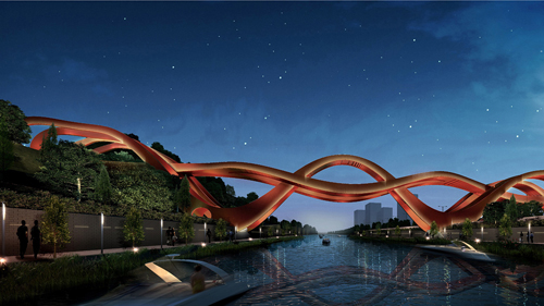 這座橋是一個(gè)工程奇跡,其獨(dú)特的建筑結(jié)構(gòu)吸引了全世界許多工程師的注意。莫比烏斯帶風(fēng)格的人行天橋架在龍王港河上,跨度為490英尺(150米),高79英尺(24米),這座橋在不同層次上有不同的路線。