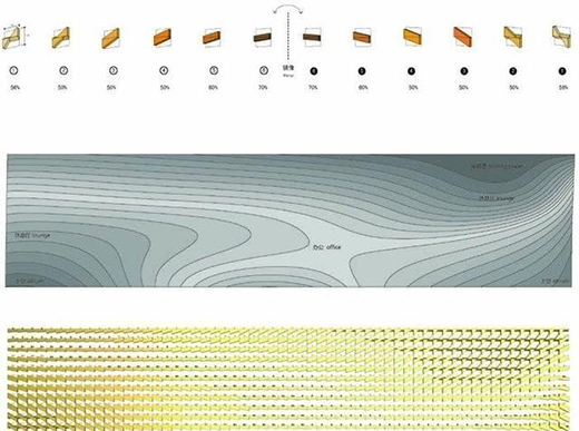 此時的表皮形態是生動且復雜的,其功效在于減弱環境特殊情況(比如光照條件的變化)所帶來的影響,使室內的工作環境更加穩定。與此同時,針對實際建造成本和施工難度的考量,設計師將立面上千奇百怪的肌理,歸納、統一成為可以實現批量生產的標準模塊和組合方式,避免過度超出預算的情況出現。