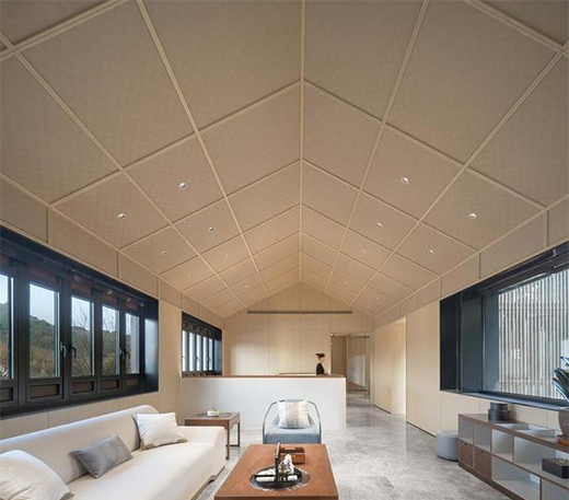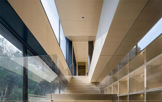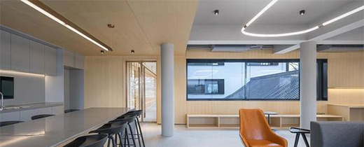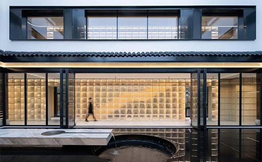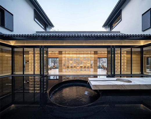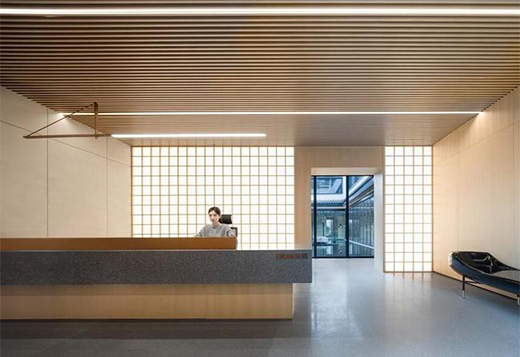 設計者在建筑內部創造出新的景觀,通過景觀化的公共空間處理,營造出和諧穩定的工作氛圍。以中庭為視覺核心,結合中庭四周傾斜的屋頂,設計師將庭院變成水景,在下雨的時候,雨水從屋檐滴落,四水歸堂,靜致遠。中庭四周都是落地玻璃,模糊了室內和室外的界限。在環廊內側,用"木屏"代替實墻,半透明的 U形玻璃將場地內的綠色隱約可見地延伸到室內,在隔開空間的同時,保持功能性和私密性,營造出曖昧而有趣的空間氛圍。傳統中式建筑中保留的“有機”與改造設計中新建立的“正交”,最終碰撞在建筑立面上,帶來強烈的視覺沖擊,不同元素間形成微妙的平衡。
