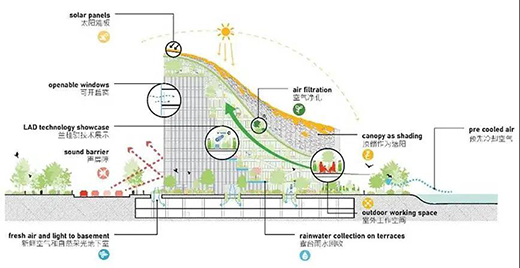 這個(gè)鋪滿綠植的退臺(tái)設(shè)計(jì)起到了空氣凈化、調(diào)節(jié)微氣候以及美化環(huán)境的作用,也間接為農(nóng)業(yè)生產(chǎn)和公共教育做出了貢獻(xiàn)。