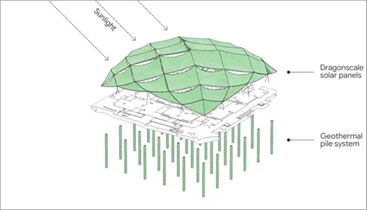 園區(qū)計(jì)劃于2021年底開放,這是谷歌在新冠疫情導(dǎo)致相關(guān)業(yè)務(wù)關(guān)閉后重返辦公室戰(zhàn)略的一部分,通過太陽能電池板和地?zé)崮艿娜诤鲜惯@個(gè)新園區(qū)完全變成零碳建筑,實(shí)現(xiàn)園區(qū)無碳排放。
