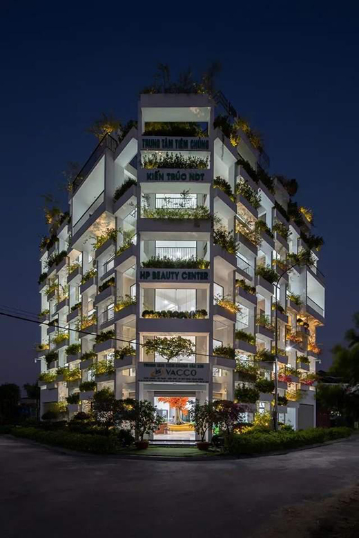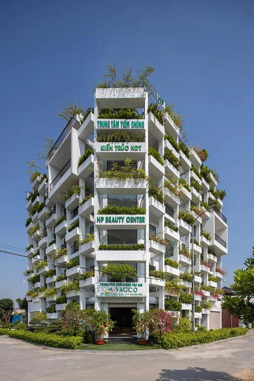 由于房子有一個朝西的立面并且靠近主干道,我們需要找到一種解決方案,不僅有助于創造一個獨特的立面,而且確保室內空間不受自然陽光直射的影響,能見度是擴大,并最大限度地減少周圍車輛的灰塵和噪音。房子的主要功能包括疫苗接種中心(1樓)、水療中心(2 樓)、出租房間(3 樓、4 樓、5 樓)和咖啡廳(6 樓)。立面由數百個不同高度的高架花園床組成,形成了一層巨大的綠色植物。該解決方案有助于為房屋創造獨特性,將自然光更好地分配到室內空間、更好的能見度和更有效的來防止來自外部的灰塵和噪音。