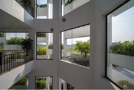 主大廳的一個大空間直接與房子中間的中庭相連,當人們走進來時,這將會帶來一種舒適的感覺??障逗椭型ブ苯舆B接樓梯和電梯,方便人們觀察和流動。此外,這也是一種幫助通風,為房屋中間區域獲得更好自然光的解決方案。在樓層之間移動的人可以感受到無處不在的綠色植物和自然光。