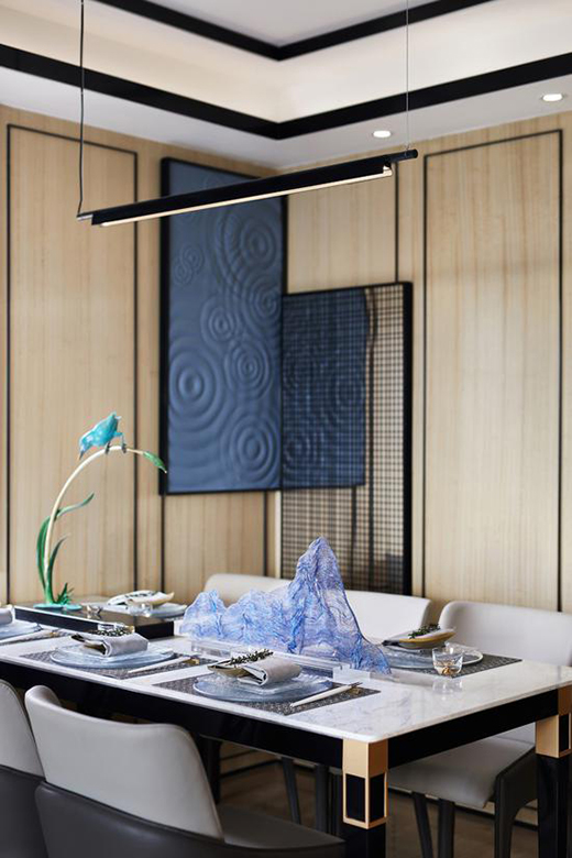 設計師賦予空間素凈簡雅的整體格調,以凝練的筆法抒寫空間意蘊,將藍與白的設色抽象化,寫意湖天一色的自然勝景,又添畫幾筆干枝與樹葉,呼應滿室清秀的藝術氣息。