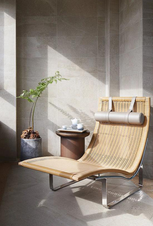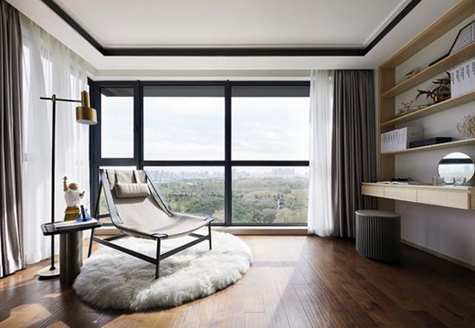 在兩面大落地窗前,簡潔書架、皮質躺椅、毛絨地毯搭配極佳的觀景視野,推窗見蔥郁樹林,呼吸間是沁人鮮氧,得一隅休閑自在。