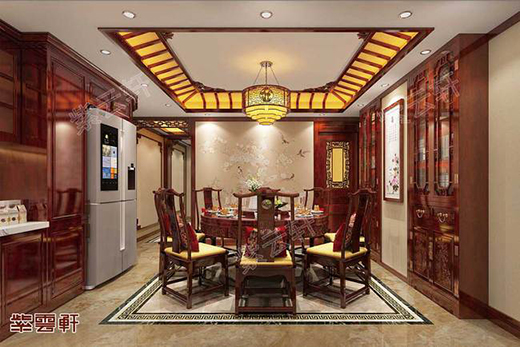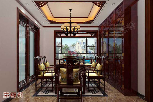 中式餐廳二,窗戶與門框都選用紅木花格邊框進行裝飾,墻邊放置一架現場定制的紅木櫥柜,餐桌選用明式官帽桌椅組合,室內充滿中式古典格調,嚴謹的布局、精致的家具,看上去非常驚艷。