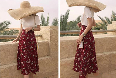 T恤+碎花裙 盡顯女人味的穿搭,比較常規的白色純色T恤,修身的版型非常貼身,凸顯著傲人的胸圍,搭配下裝的碎花小紅裙,隨意間凸顯迷人的身材曲線,超級好看,紅色搭配白色的色調真的不挑人,閉眼穿上都能凸顯氣質,顯瘦顯高還顯比例,造型滿分,這個夏季就這么穿吧!