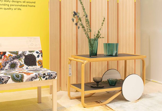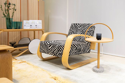芬蘭多樹,80%的森林覆蓋率讓木質結構成為芬蘭設計師的摯愛,國寶級品牌Nikari的設計靈感便是源于此。現場展示的NIKARI-ARTE SOHVA 沙發,其外形將北歐傳統設計與當代設計結合,把精湛的制作工藝和可持續發展理念融入木質家具中,并采用了芬蘭著名插畫家Klaus Haapaniemi的經典森林動物圖案,豐富又內斂地展現森林的原生之美。配合Nikari展示的設計作品則是來自著名設計品牌Artek的Tea Trolley桌幾。 Artek是由有“芬蘭設計之父”之稱的Alvar Aalto和他的妻子Aino Aalto共同創立的,之所以與Nikari產品搭配展出,是因為在Alvar Aalto生命的最后幾年里,Nikari工作室與其有著緊密的合作與聯系。在他們的作品中,無論是風格和材質都能帶給人關于生活的溫馨聯想,也同時能展現木的自然、穩重、溫馨以及背后的生命力。