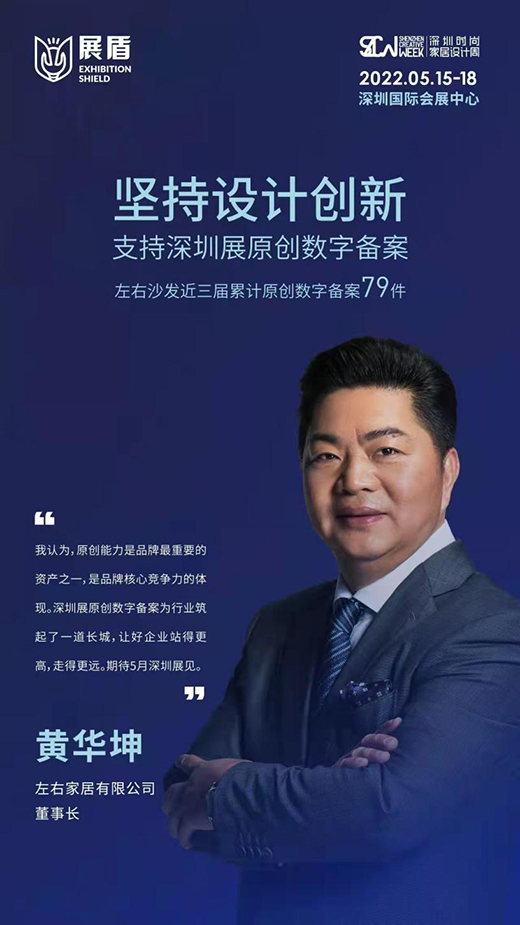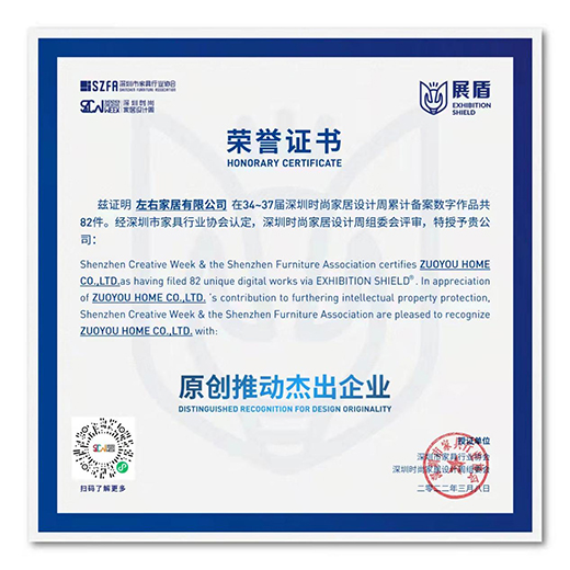 堅持原創設計,成就品牌高度。左右家居在34-37屆深圳時尚家居設計周累計備案數字作品82件,經深圳市家具行業協會認定、深圳時尚家居設計周組委會評審,被授予為“原創推動杰出企業”。