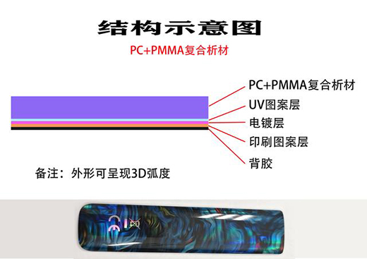 復(fù)合板材大多是用PC\PE\ABS\PMMA料做多種工藝流程處理,從而表面效果具有很強(qiáng)的裝飾性,在前兩年前左右很多手機(jī)商在手機(jī)的背殼上做復(fù)合板材的裝飾工藝,現(xiàn)的一些低端品牌仍使用復(fù)合板材做工藝(電鍍漸變色,電鍍膜 等等),復(fù)合板材進(jìn)行工藝處理后在裝飾上有驚人的表現(xiàn)能力,有年輕活力的感覺。復(fù)合板材的厚度在0.5~0.8mm最合適,弧度過大會(huì)增加貼膜難度,可實(shí)現(xiàn)性難。
