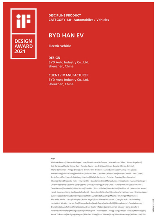 此次德國iF設計獎評選,云集了來自世界各地的98位評審團成員,他們給予了比亞迪漢EV高度的評價:“比亞迪漢EV為中國用戶提供了健康、安全、環保的日常通勤和家庭出行解決方案。漢EV從中國傳統文化中汲取設計靈感,其新潮前衛的外觀以及大氣豪華的內飾設計重新詮釋了中國獨特的傳統美學。與此同時,漢EV百公里加速3.9s的出色性能,搭配智能網聯系統,都使得駕駛體驗更加令人興奮。”