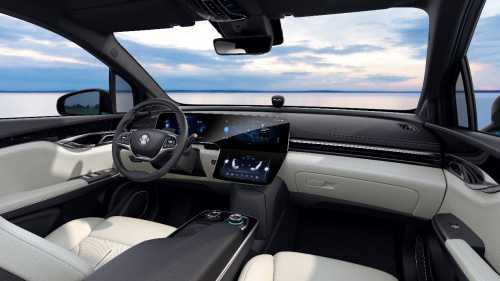 在內飾方面,設計師同樣強調“7”的設計靈感。7字形狀的曲面一體成型全液晶飛梭三體屏,由兩塊12.3英寸+一塊10.1英寸屏幕組成,集成儀表盤、多媒體屏幕與空調及功能控制,提供“飛屏”“分屏”新玩法,用戶通過手機APP,即可將手機導航信息、無人機視頻等內容分享至中控屏,實現全觸控的交互體驗。