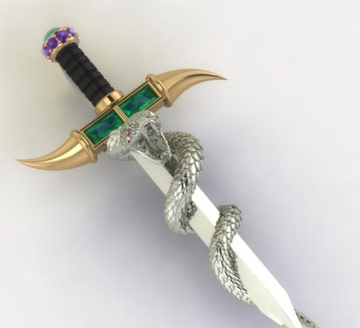 David Kirk 設計的劍型吊墜獲得“零售商年度最佳獎”,這是一件充滿想象力的作品——白金雙刃劍上纏繞一條手工雕刻的金蛇,蛇眼鑲嵌紅寶石,黃金劍格鑲嵌祖母綠寶石,劍柄為黑玉髓,劍首則裝飾紫水晶。