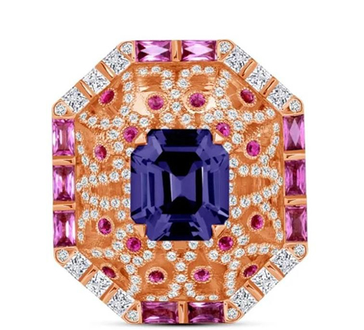 AG Gem 寶石公司的一枚緬甸尖晶石戒指獲得“供應商年度最佳獎”。這枚戒指充分展示寶石鑲嵌工藝的繁復——八邊形戒面形狀與4.38ct緬甸尖晶琢型相同,主石周圍以鉆石和粉色藍寶石鑲嵌構花卉圖騰,最外圈則采用階梯型切割粉藍寶和方形鉆石強調幾何線條,完美對稱的比例創造出強大的視覺張力。