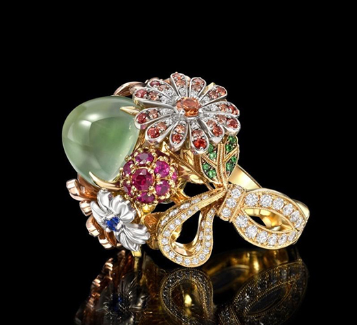 運用黃金、白金和玫瑰金制作,主石為一顆9.44ct綠色月光石,點綴鉆石,黃鉆,綠色石榴石,紅寶石和彩色藍寶石。