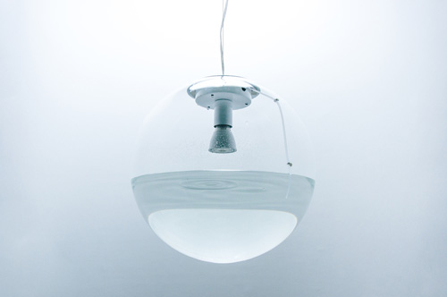 由 LED 燈泡、玻璃燈罩、習慣組成的 rain,懸在空中像個小小的魚缸。由吸管將水吸至燈的頂部,再一滴滴如雨點般落下,不斷循環。當水滴下并撞擊下面的水池,光線會改變和折射,玻璃球放大光線并投射到地板上。