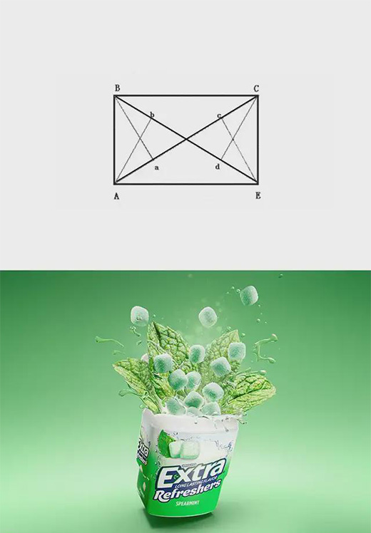 在以1:1.618比例構(gòu)成的矩形ABCD上,畫出對角線AC、DB,并過A、B、C、E4點作AC、EB的垂直線,得垂足a、b、c、d,此法可以簡化尋找美感誘發(fā)點的方法(還是直接看圖吧)。